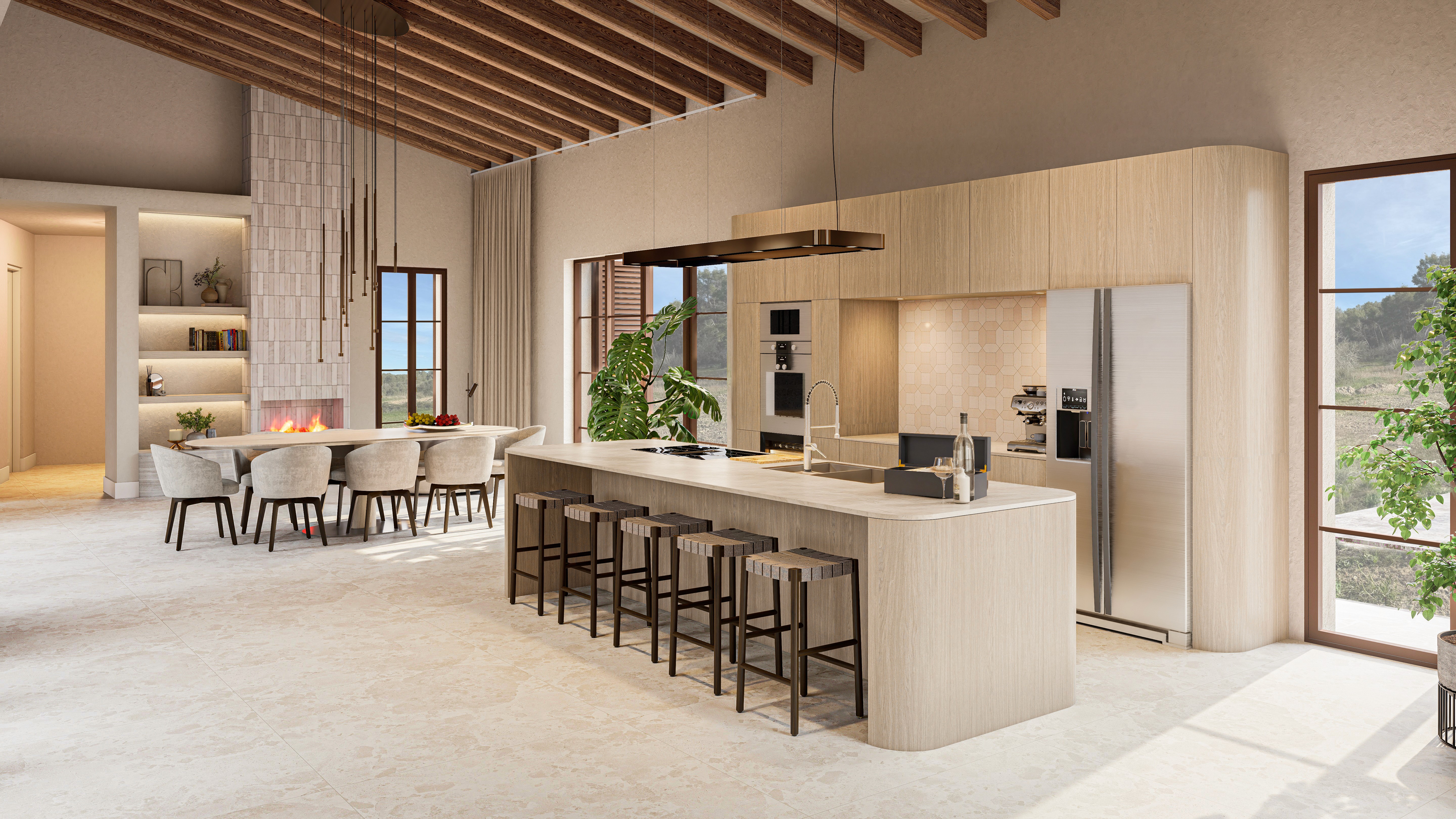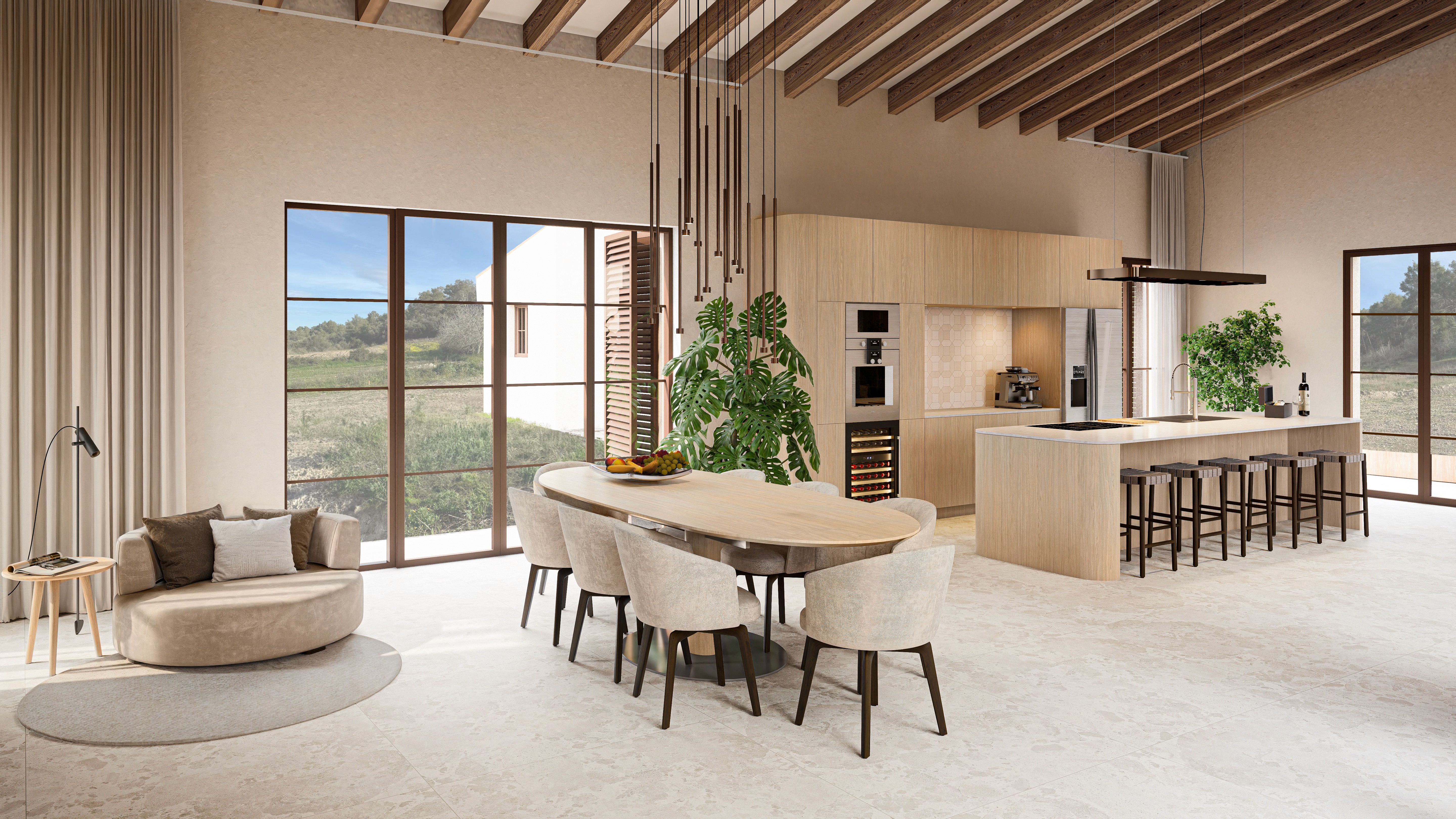 The living room and kitchen open onto the covered part of the terrace, which offers panoramic views of the surroundings. The finca is located higher up on its own plot, giving you a view of your own land. Due to its unique location in the valley and the surrounding plots that cannot be built on, you will feel like you are in your own valley.